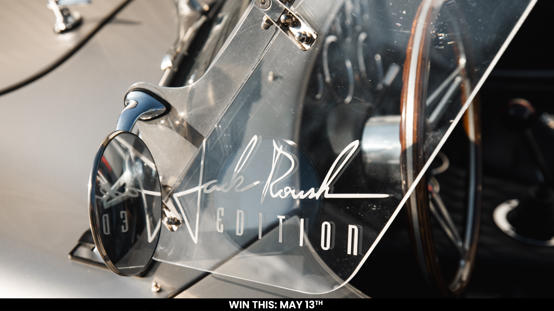 - Polished Halibrand-style 18” wheels with safety-wired three-eared knockoffs